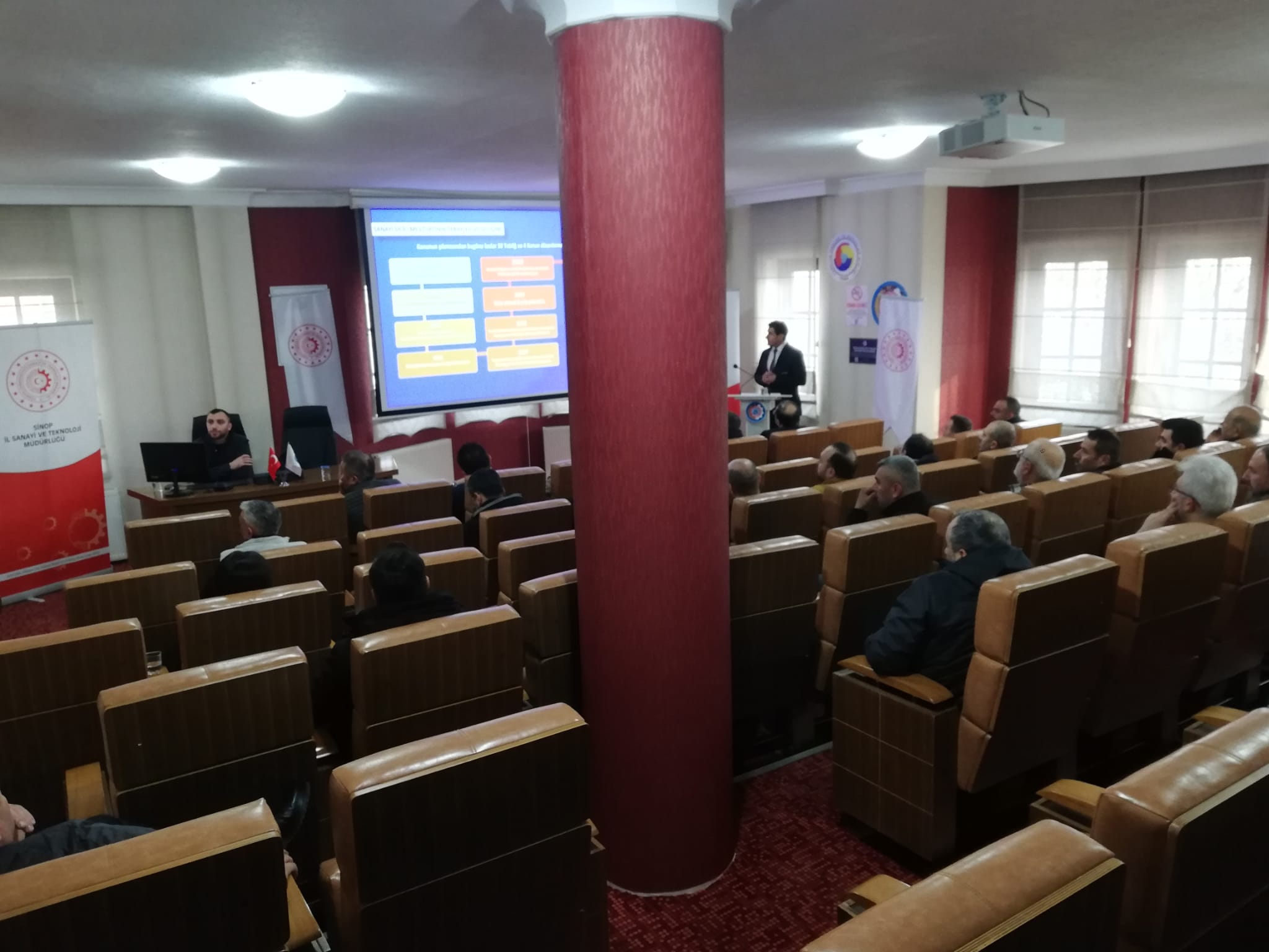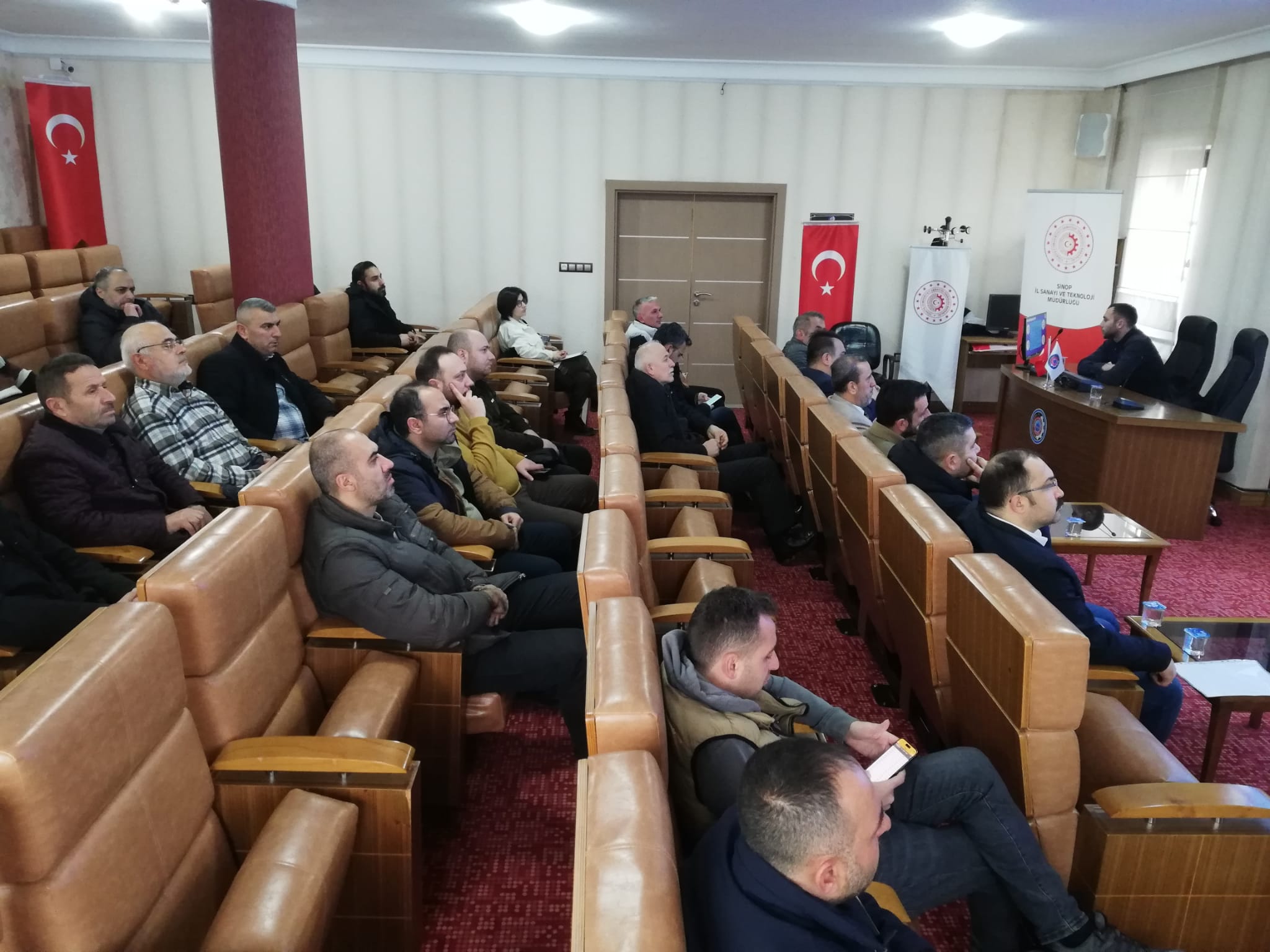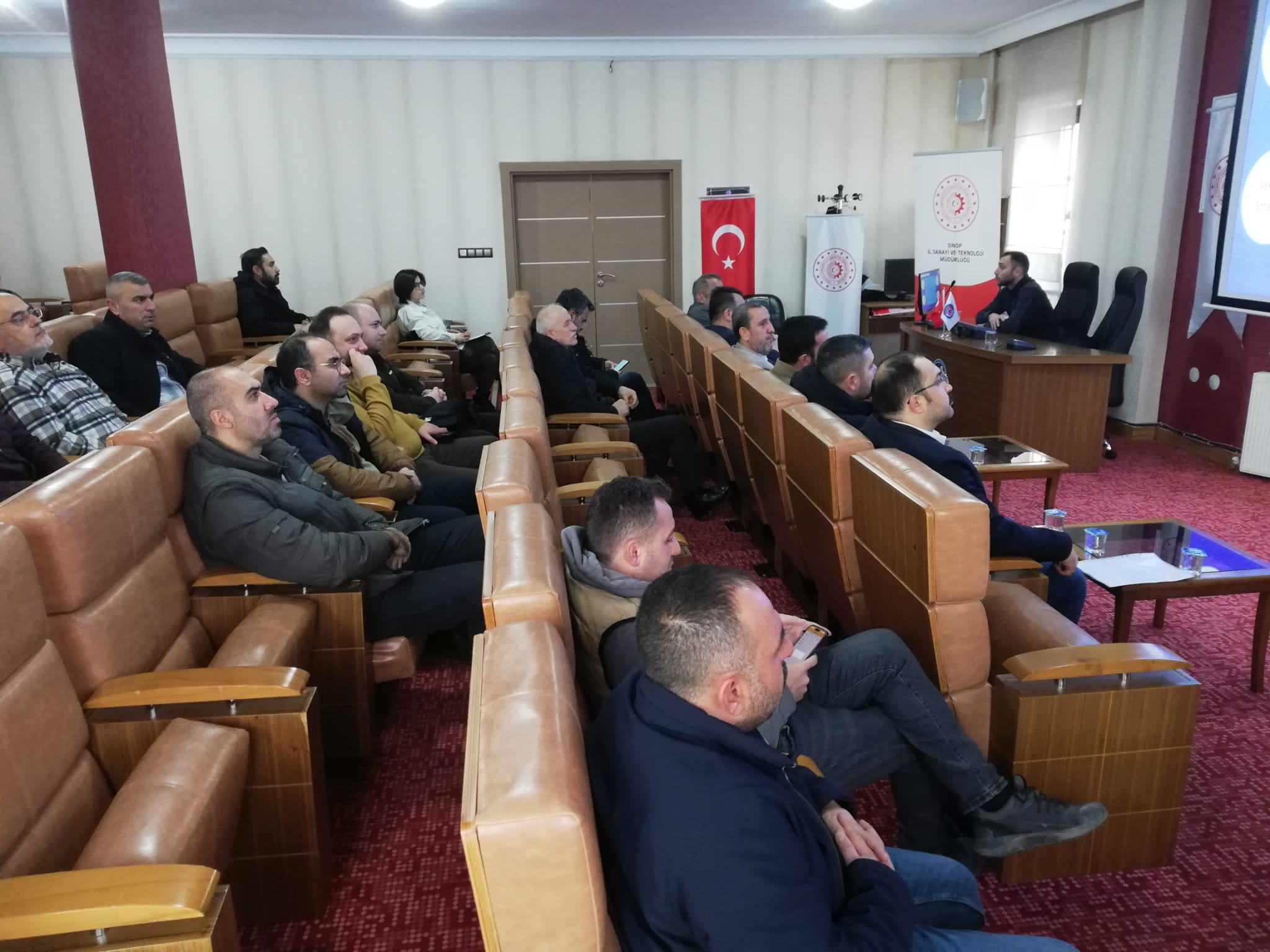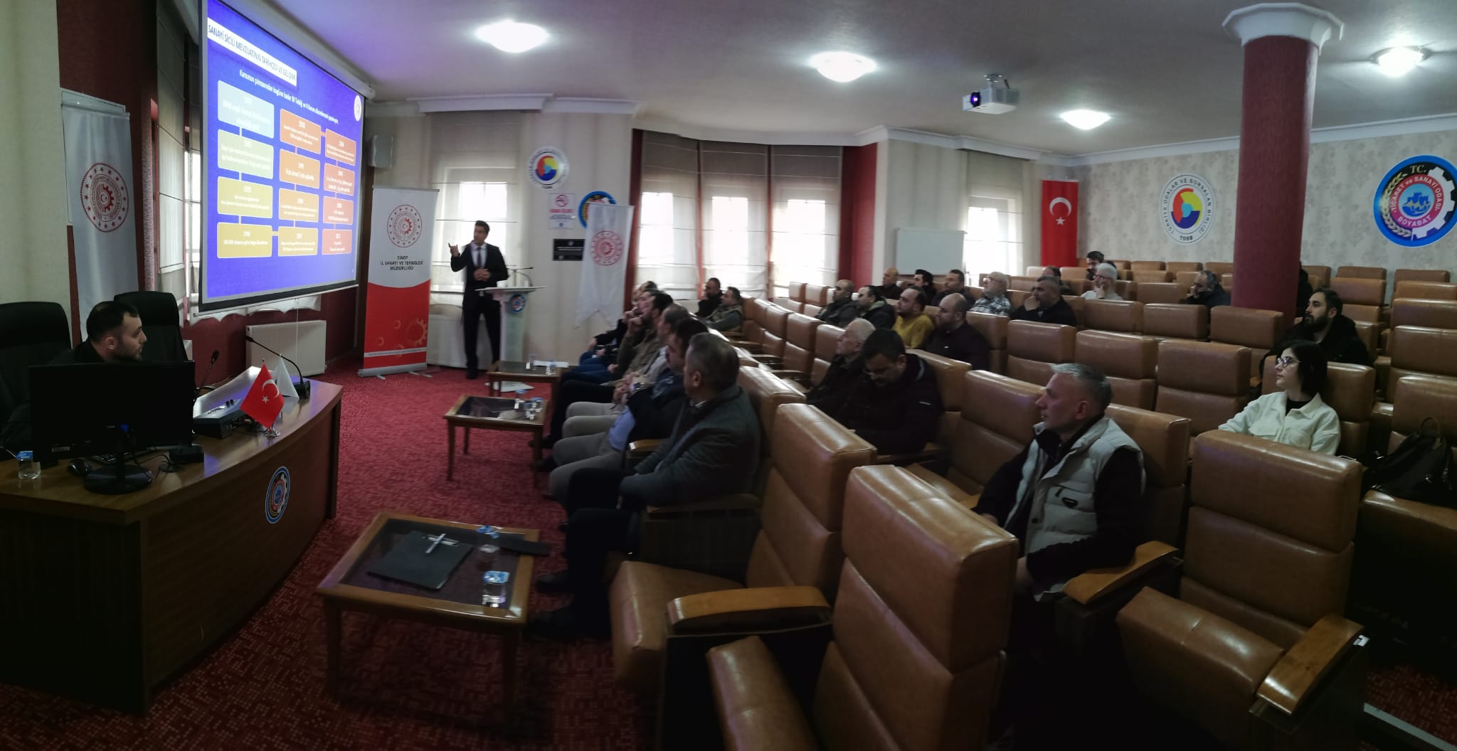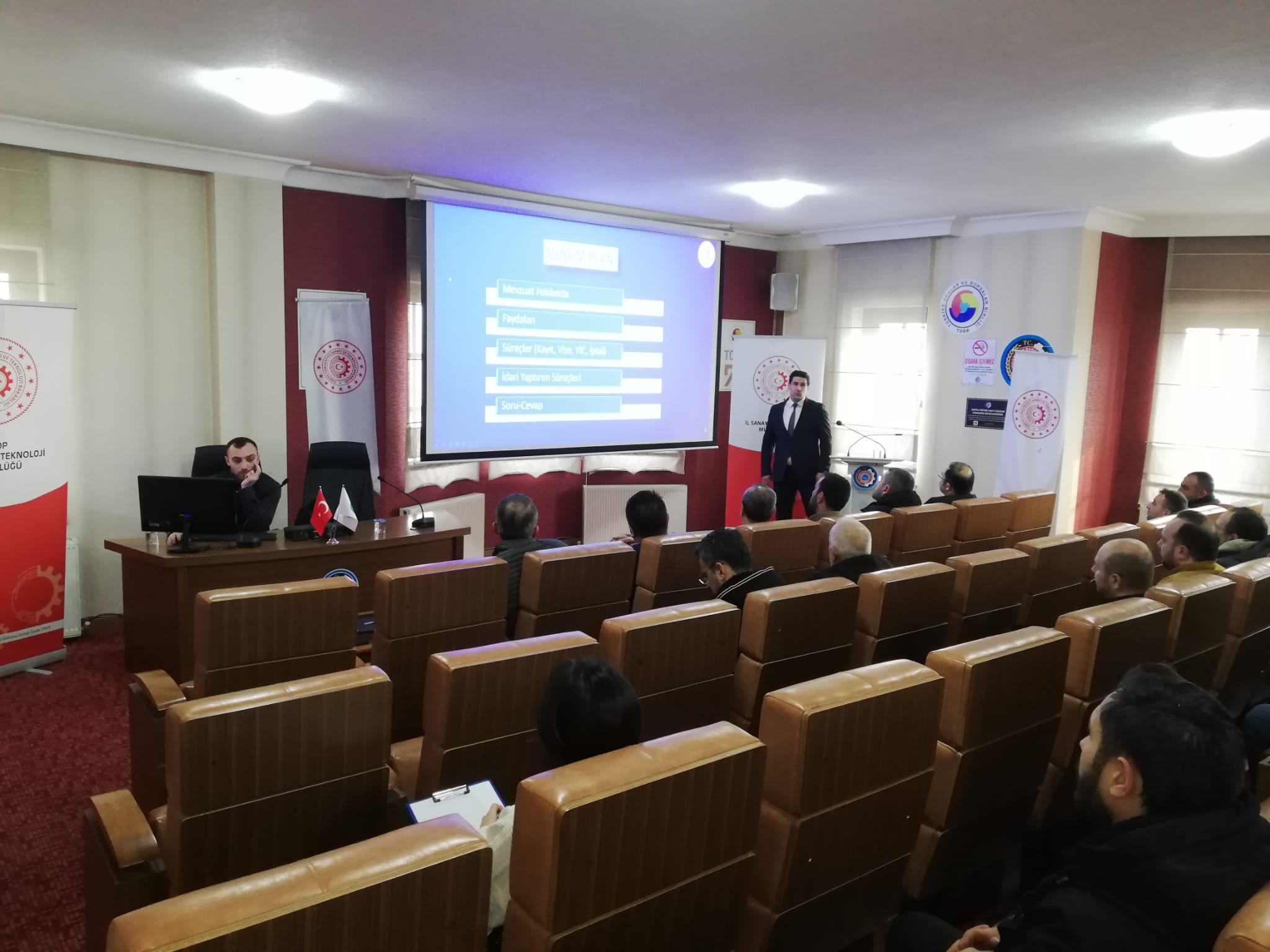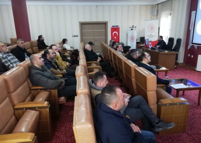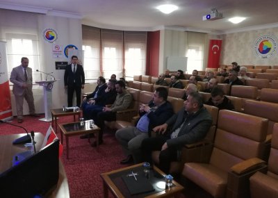 Toplnatıda Sanayi Sicil Belgesi hakkında teknik bilgiler ve avantajları ile ihlal durumlarında uygulanan cezalar hakkında Sanayi ve Teknoloji İl Müdürümüz Ömer Sarıkaya ve Tekniker Ömer Gönel tarafından sunum yapıldı.